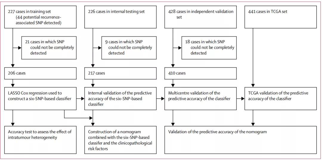 在这项回顾性分析和多中心验证研究中,研究者使用了来自中山大学(中国广东广州)的227例局部肾透明细胞癌患者的石蜡包埋标本进行检测,通过对癌症基因组图谱 The Cancer Genome Atlas(TCGA)肾透明细胞癌(Kidney Renal Clear Cell Carcinoma,KIRC)数据集(n=114,906600 SNPs)的全基因组关联研究的探索性生物信息学分析,识别出44个潜在的与复发相关SNPs。基于SNP状态与患者无复发生存的相关性,研究者利用LASSO Cox回归建立了一个基于6个SNP的分类工具,在训练集中对同一肿瘤内的另外两个区域的瘤内异质性进行了研究。利用六个SNP分类工具在内部测试集(n=226)、独立验证集(2004年1月1日至2012年12月31日期间,中国三家医院治疗的428例患者多中心研究)和TCGA集(1998年至2010年在美国接受局部肾透明细胞癌切除术的441例患者的回顾性分析)中得到验证。
