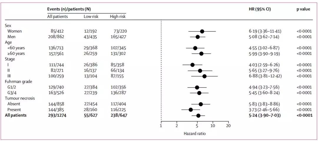 研究结果显示,虽然在具有完整SNP信息的内部测试集206例中有48例(23%)存在瘤内异质性,但在训练集中的三个不同区域(5年曲线下面积[AUC])基于6个SNP的分类器的预测精度是相似的:在区域1中为0.749 (95% CI:0.660-0.826),在区域2中为0.734(95%CI:0.651-0.814),在区域3中为0.736(95%CI:0.649-0.824)。基于六个SNP的分类工具精确预测了三个验证集中患者的无复发生存率(内部测试集HR=5.32[95%CI:2.81-10.07],独立验证集HR=5.39 [95%CI:3.38-8.59]在中,TCGA集中为4.62[ 95%CI:2.48-8.61];所有集中p<0.0001),并且与患者年龄、性别、肿瘤分期、分级、坏死程度无关。将分类工具和临床病理学危险因素(肿瘤分期,分级和坏死)结合起来构建列线图,其预测准确性显著高于单独的每个变量(5年AUC为0.811 [95%CI:0.756-0.861])。