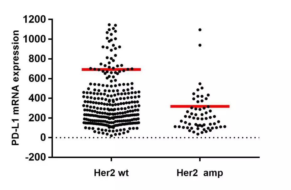 图1不同HER2基因状态下PD-L1 mRNA表达水平