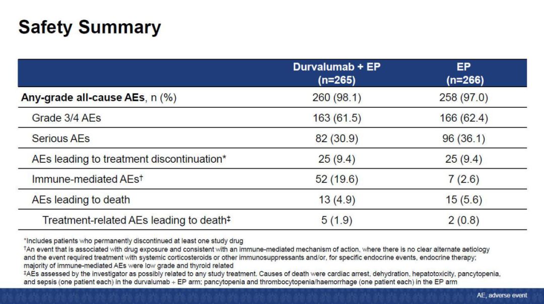 durvalumab联合化疗方案的安全性和耐受性与药物已知的安全性特征一致,显示该方案是安全可行的。CASPIAN临床试验证明durvalumab联合4周期化疗比传统化疗的效果更好,可以显著改善患者生存期,这对小细胞肺癌患者来说是新的选择和希望。