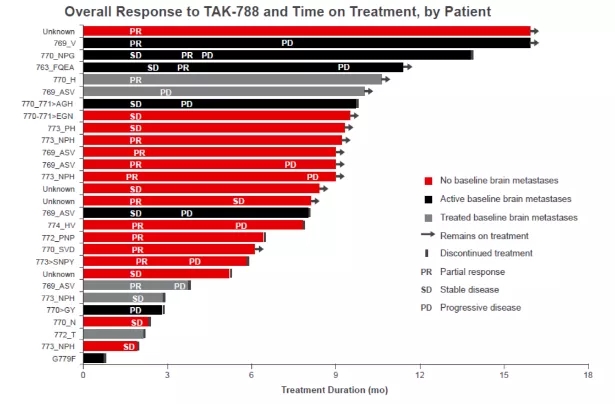 这项临床研究首先通过“3+3”剂量爬坡确定II期推荐的给药剂量,随后进行队列扩展,以进一步验证TAK788的疗效及安全性。研究的主要终点是ORR。值得注意的是,该研究允许非活动性脑转移的患者入组。最终,TAK788的推荐剂量确定为160mg,口服,每日一次,共有28例患者接受了推荐剂量的TAK788治疗,其中12例患者存在脑转移。