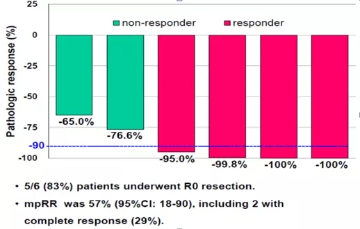 研究发现,7例患者的ORR为100%,接受手术治疗的6例患者中,5例患者为R0切除,主要病理学缓解率为57% (图3),其中29%的患者为完全缓解。但需要注意的是,7例患者均因不良反应导致治疗中断,5例出现剂量下调。