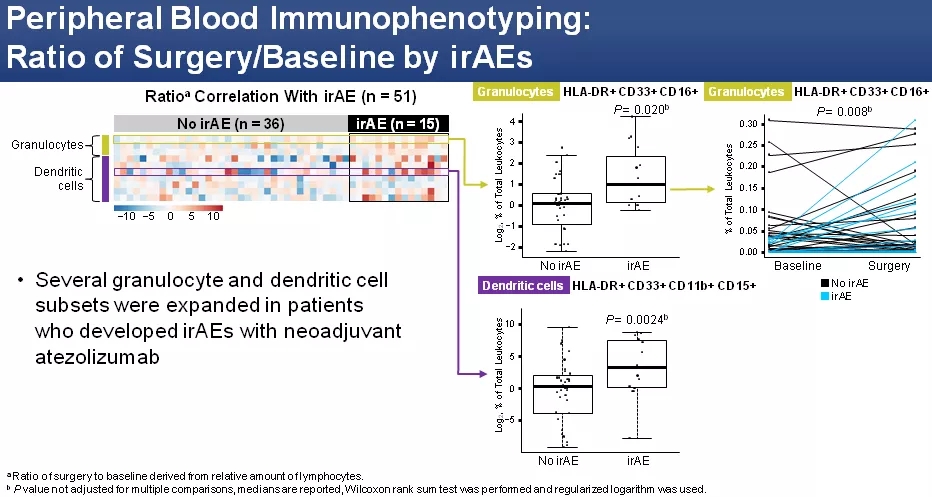 新辅助免疫治疗导致irAE的患者中,相比没有irAE的患者,一些粒细胞和树突状细胞亚集得到扩增