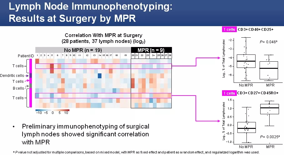 淋巴结活检分析也提示了免疫表型与MPR的相关性,不同T细胞亚集在两组不同分布:在MPR组,CD3+CD27+CD45RO+ T细胞的水平更高;而非MPR组,CD3+CD40+CD25+ T细胞的水平更高。
