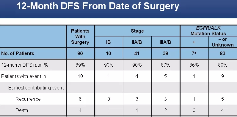 结果:截止2019年9月研究入组已接近完成,计划入组180例,已招募164例。101例患者的数据分析显示,11%为1B期,46%为Ⅲ期;95%的患者完成了2个周期的治疗,其余完成了1个周期的治疗;89%完成了手术。完成手术的90例患者中,12月DFS率为89%,1B期、Ⅱ期、Ⅲ期分别为90%、90%、87%。