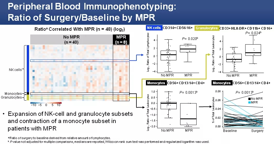 方法:入组患者给与2周期atezolizumab新辅助治疗后行手术切除。所有患者在免疫治疗前及术中均行肿瘤组织留取、淋巴结(LN)活检及外周血细胞(PB)采样,采用免疫流式细胞术分析配对外周血、筛选和手术切除的淋巴结标本,部分患者进行了血浆细胞因子分析,分析了免疫表型及变化与疗效(MPR,大病理缓解,可视肿瘤细胞不到10%)和安全性的相关性。