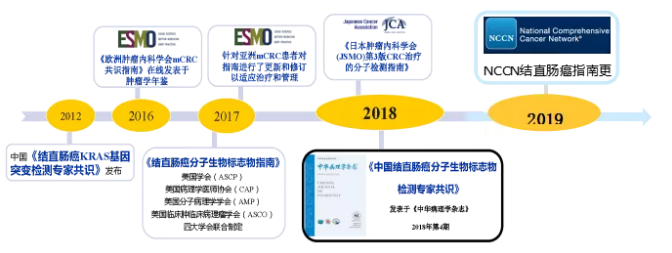肠癌的治疗越来越趋于精准化,如下图所示,从2012年开始,国内外关注分子生物标记物检测的指南和共识推陈出新. 国际指南一致推荐晚期肠癌患者进行RAS/BRAF及MSI的常规检测,确认了其临床价值。中国在2018年也发布了肠癌相关的生物标记物检测共识,共识同样推荐所有的晚期肠癌患者在确诊后进行RAS和BARF检测,同时明确RAS基因检测应包含KRAS/NRAS的第2、3、4外显子,共12个检测位点;同时共识也提出可以考虑对所有CRC患者进行MSI检测,以筛查林奇综合征,指导预后及免疫治疗。