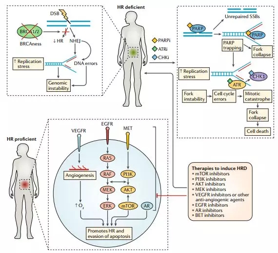总结:同源重组缺陷(HRD)或表现出‘BRCAness’/‘HRDness’的肿瘤易对于PARPi敏感。PARPi获得性耐药目前研究主要是由于表型改变导致同源重组(HR)恢复或通过减轻复制压力,这些可通过PARP抑制剂与ATR抑制(ATRi)和/或抑制细胞周期检查点激酶(CHKi)(如CHK1)的组合来克服。特定肿瘤类型存在的致癌驱动因素和代谢途径可以驱动HR活性,使癌细胞存活和PARP抑制剂耐药。因此,可通过对高HR的肿瘤诱导成为HRD,从而产生PARP抑制剂的敏感。由于目前针对DNA损伤修复的药物增多,迫切需要对相关的机制及标志物的研究及探索,从而明确对于哪种类型的肿瘤以及在什么时间点应联合使用(图6)。