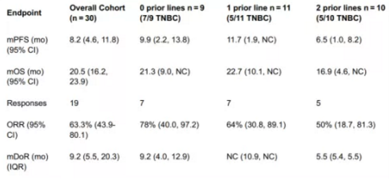 入组gBRCA突变/HER2-转移性乳腺癌,允许既往接受过铂类化疗,既往未接受PARPi或抗PD-L1治疗。患者接受奥拉帕利300 mg/bid治疗4周后,接受奥拉帕利300 mg/bid和durvalumab 1.5g IV q4联合治疗,直到病情进展。研究发现奥拉帕利和durvalumab联合使用有较高的总有效率 (ORR 63.3%),之前接受≤一线化疗的患者的ORR为70%,治疗有效的患者显示出持久的获益,中位DOR为9.2个月,PFS中位数为8.2个月,平均OS为21.5个月。