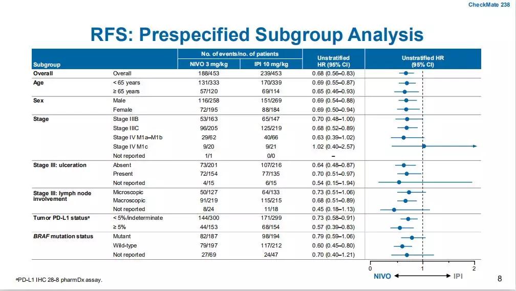 CheckMate238是一项III期随机、双盲研究,比较了纳武利尤单抗对照伊匹木单抗用于IIIB/C期或IV期黑色素瘤完全切除术后辅助治疗的疗效。这个研究也奠定了纳武单抗术后辅助治疗的地位,初步结果在2017年的ESMO进行了报道。此次ESMO更新了该研究3年数据以及生物标志物探索。纳武单抗治疗组的3年无复发生存率比伊匹木单抗提高了13%(58% vs. 45%,HR 0.68;p<0.0001)。在BRAF基因突变型和野生型,PD-L1高表达及低表达等各个亚组中,都看到了纳武单抗的生存获益,除了M1c期的患者。该研究也分别从转录组水平(IFN-γ 10-gene signature)、肿瘤突变负荷(TMB)、微环境中CD8细胞浸润丰度以及外周血髓样干细胞(MDSCs)水平进行的分析。从结果看,IFN-γsignature高表达,TMB高以及CD8细胞浸润高的患者都能从纳武单抗或者伊匹木单抗治疗获益,而MDSCs水平无法预测免疫治疗疗效。