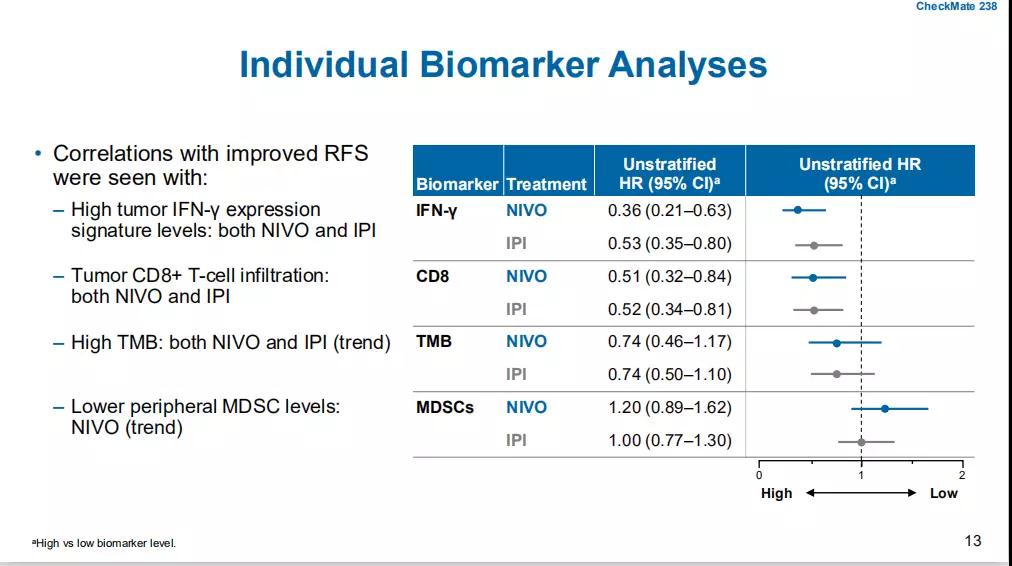 此外,该研究的另一个亮点就是对生物标志物的探索。我们知道,PD-1单抗单药在晚期黑色素瘤具有较高的缓解率(超过40%),同时对比伊匹单抗,具有更低的3-4级副作用以及临床耐受性。但在辅助治疗中,哪些是单药PD-1单抗更优的获益人群值得关注。和晚期标志物相似,联合检测,如TMB高伴IFN-γsignature高表达患者,临床获益更加显著,但两者低的患者依然可以看到临床获益,也就是说,目前这几项生物标志物仅能增加阳性预测,但不能减少阴性预测价值。