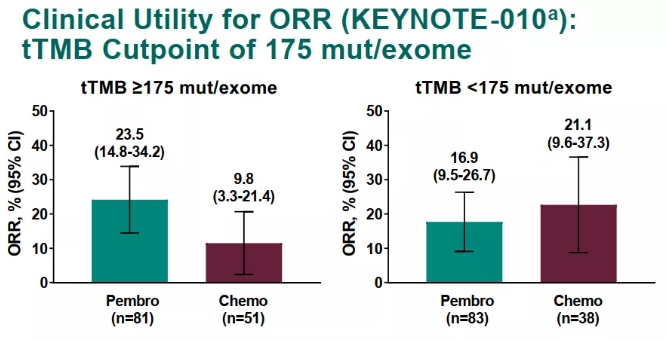 KEYNOTE-042研究中,在tTMB≥175 mut/exome的患者中,帕博利珠单抗组和化疗组的中位OS分别为21.9个月和11.6个月(HR=0.62;95%CI: 0.48~0.80);中位PFS分别为6.3个月和6.5个月(HR=0.75;95%CI: 0.59~0.95);两组的ORR分别为34.4%和30.9%。在tTMB<175 mut/exome的患者中,帕博利珠单抗组和化疗组的中位OS分别为12.0个月和12.3个月(HR=1.09;95%CI: 0.88~1.36);中位PFS分别为4.1个月和6.3个月(HR=1.27;95%CI: 1.04~1.55);两组的ORR分别为18.8%和22.4%。