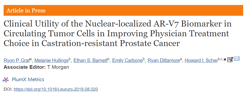 Graf RP,Hullings M,Barnett ES,et al.Clinical Utility of the Nuclear-localized AR-V7 Biomarker in Circulating Tumor Cells in Improving Physician Treatment Choice in Castration-resistant Prostate Cancer.Eur Urol 2019;:.DOI:10.1016/j.eururo.2019.08.020