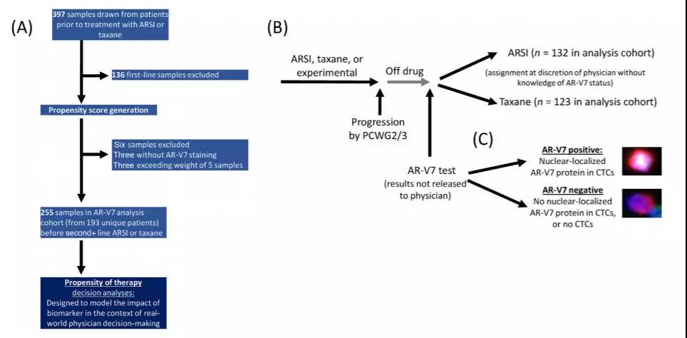 该研究人群为193例进展性mCRPC患者的横断面队列,在二线或后线治疗决定时从中抽取255个样本,然后接受ARSI或紫杉醇治疗。在长达3年的随访中,从血液样本中鉴定出循环肿瘤细胞(CTC),并进行AR-V7检测。医生对AR-V7状态以及实验室对检测结果均保持未知。研究者根据患者预后来衡量医生选择ARSI或紫杉醇的倾向;并根据药物类别测量了经医生倾向调整后的总生存率(OS);OS数据在没有和未知细胞核AR-V7状态的情况下进行分析。