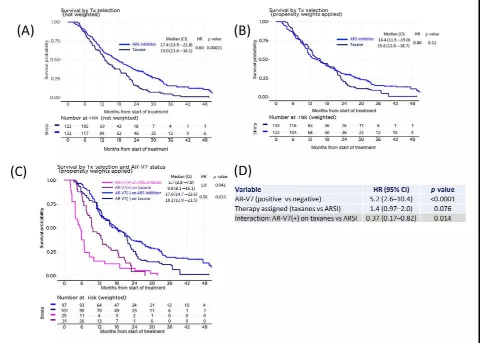 对于晚期疾病或者已经接受过ARSI治疗的患者,医生倾向于选择紫杉醇而不是ARSI治疗。调整医生倾向后,紫杉醇治疗组和ARSI治疗组之间没有观察到明显的OS差异(中位数15.6 vs 14.4个月;p=0.11)。CTCs中可检测到细胞核AR-V7的患者,紫杉醇组的生存率高于ARSIS组(中位数9.8 vs 5.7个月;p=0.041)。AR-V7阴性患者选择ARSIS治疗的生存率高于紫杉醇(p=0.033),但重叠曲线限制了解释。多变量模型显示AR-V7状态与药物之间存在强大的相互作用,AR-V7阳性患者选择紫杉醇治疗的死亡风险较低。