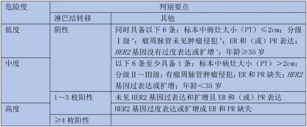 a:组织学分级/核分级;b:瘤周脉管侵犯存在争议,它只影响腋淋巴结阴性的患者的危险度分级,但并不影响淋巴结阳性者的分级;c:HER2的检测必须采用有严格质量把关的免疫组织化学或荧光原位杂交法(FISH)、色素原位杂交法(CISH)
