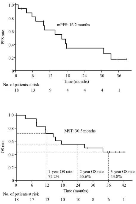 这项名为LOGiK1401的研究在2014年9月至2015年12月共纳入18例PS评分为2-4分的患者(其中,2分、3分及4分的患者分别有12例,5例和1例)。患者中位随访时间为27.3个月。