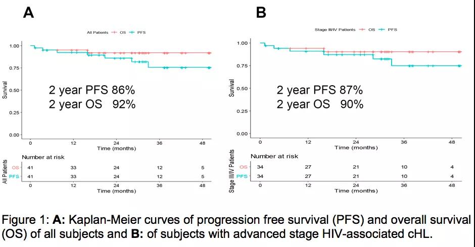 结果:41名患者(93%为男性)纳入研究,中位年龄为48岁(24-67岁),分期II期17%、III期27%和IV期56%。总人群(N=41)的两年PFS为86%(95%CI:.74,.98)。2年总体生存率(OS)为92% (95% CI: 0.83, 1.0), 3例死亡,其中1例与治疗相关(图1A)。对于晚期患者(N=34), 2年PFS为87% (95% CI: 0.76, 0.99), OS为90% (95% CI: 0.8, 1.00)(图1B)。安全性方面与E1研究中接受生长因子治疗的BV-AVD组患者非常相似。本研究中神经病变的发病率高于E1,(所有等级:49%和29%,P=0.01;G3/4:9.8%比5%,p=0.06)。AMC 085 研究的3级中性粒细胞减少明显高于E1的BV-AVD组:57% vs. 29% (p<0.01)。本研究与E1治疗期间感染 (33% vs. 44%)和发热性中性粒细胞减少症(11% vs. 15%)的发生率相似。两名患者因入组后服用强CYP 3A4抑制剂ritonavir发生方案违背而出组。1例在第1周期第7天出现发热性中性粒细胞减少症和4级胰腺炎,另1例在第2周期前出现发热性中性粒细胞减少症。第3名患者在入组前2天停用了ritonavir,发生了长期的3级神经病变。诊断时中位CD4+和CD8+T细胞计数分别为289 cell /mm3(32-818)和486 cell /mm3(26-1780)。在可评估的患者中,治疗1个月后在第2周期的第1天可以观察到CD4+和CD8+T细胞计数增加到545 cell /mm3(161-2130)和 745 cell /mm3(132-3106)。69%的基线病毒载量检测不到。对于诊断时可检测到病毒载量的患者,中位病毒载量为52 copies/ml (22-15706)。HIV-1病毒载量在治疗期间下降。3/32患者2周期后PET/CT显示阳性。29名患者中有1名在第6周期结束时PET/CT呈阳性,根据活检和随访结果判断为假阳性。