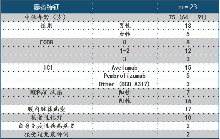 中位起效时间为8周,12个月无进展生存率为39%。年龄小于75岁的患者(80% vs. 46%),基线LDH正常的患者(71% vs. 50%),发生免疫相关不良事件的患者(100% vs. 47%),以及MCPyV阴性患者(69% vs. 43%)客观缓解率更高。能够达到完全代谢缓解的患者基线接受FDG-PEG扫描时肿瘤体积更小(完全代谢缓解肿瘤:35.7mL,未完全代谢缓解肿瘤:187.8mL)。