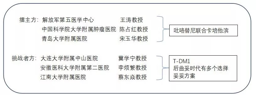 “王者之路”擂台赛分为擂主方和挑战者方,针对后曲妥时代晚期HER2阳性乳腺癌二线最优方案分别阐述论点与论据,擂主方所推方案为吡咯替尼联合卡培他滨方案,挑战者方可自行选择支持方案发起挑战。