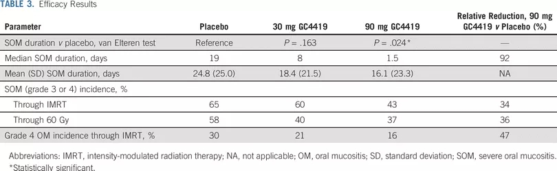 先前的1b期/2a期试验结果显示,头颈癌患者在每次调强放射治疗同步顺铂治疗前,接受30 mg或90 mg的GC4419,其严重口腔粘膜炎的发生率、持续时间和严重程度均降低。爱荷华大学卡弗医学院放射肿瘤学系住院部主任Carryn M. Anderson教授及其同事开展了双盲、多中心2b期试验评估了GC4419对223例局部晚期口腔癌或口咽癌患者(中位年龄57岁,范围30~84岁,86%为男性)严重口腔粘膜炎的疗效和安全性。研究人员随机分配患者在每次调强放疗前60分钟静脉注射GC4419,剂量为30 mg(n=73)或90 mg(n=76)或安慰剂(n=74)。患者最终或者术后接受2~2.2 Gy的调强放射治疗,辐射总剂量为60~72 Gy,同时,每3周给予一次80~100 mg/m2或者每周给予一次30~40 mg/m2的顺铂治疗。研究人员根据WHO分级,在放射治疗期间每2周评估一次口腔黏膜炎的严重程度,在放射治疗完成后每周评估一次,持续8周。各剂量组与安慰剂组的严重口腔粘膜炎持续时间作为主要终点。