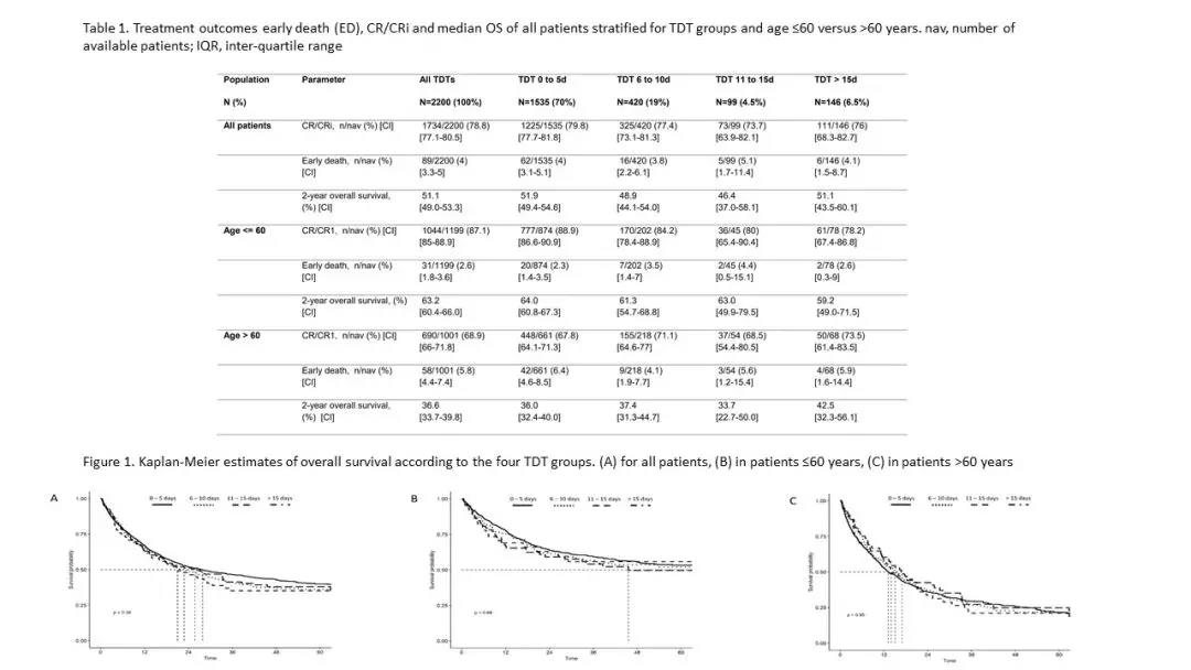 该研究共纳入2,200名新诊断的AML患者,均接受了标准剂量阿糖胞苷联合柔红霉素(7+3)的持续强化诱导治疗,研究结果表明无论是年轻还是老年患者,TDT与治疗反应或生存均无相关性。尽管进行了多变量分析,但不能完全排除偏倚,偏倚主要由医师判断为临床稳定患者的较长TDT所致。目前AML一线强化治疗强调按照疾病风险分层进行相应的治疗,本研究的TDT数据表明,对于临床稳定的患者在开始治疗前等待遗传学和其他检验结果是安全合理的方法,以便根据检验结果选择最佳的治疗方案。