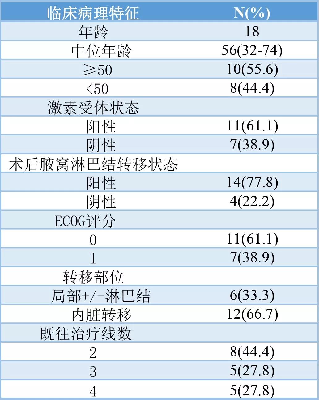 方法:该研究为单臂、单中心的研究,纳入研究人群是既往接受蒽环或紫杉醇治疗的复发转移性HER2阴性乳腺癌患者,复发转移后至少接受过1次化疗,激素受体阳性患者至少接受过1次内分泌治疗。入组患者给予安罗替尼12mg口服d1-14,21天为1周期,直到肿瘤进展或患者不能耐受。主要研究终点为PFS;次要研究终点为ORR、OS、安全性和毒性。