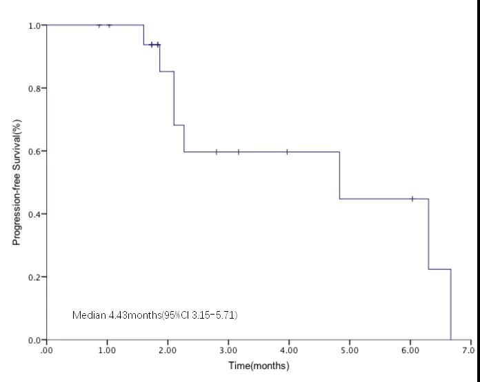 结果:自2018年7月12日至2019年7月1日,本研究共计入组18例患者,中位年龄为56岁(32-74岁),中位随访时间为2.8月(1.0-9.9月)。中位PFS为4.43个月[95%可信区间(CI),3.15-5.71月],ORR为11.1%(2/18),DCR为77.8%(14/18),mOS尚未达到,本研究最常见的与治疗有关的3~4级不良反应为高血压(5/18,27.8%),可通过药物有效控制,未观察到其他3~4级不良事件,没有患者因不良事件而减少安罗替尼的使用剂量。最常见的1-2级不良反应为乏力10/18(55.6%),TSH升高7/18(38.9%),高血压5/18(27.8%)。