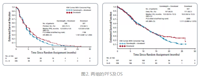 这是一项前瞻性、III期临床研究,入组患者为IIIB或IV期的肺腺癌且诊断至入组时间至少相差6个月,驱动基因均为阴性。患者需既往接受过含铂双药治疗后进展,PS评分为0-1分且有足够的器官功能。稳定性脑转移患者允许入组。但近4周体重下降超过10%的患者不允许入组。多西他赛及Ganetespib的治疗剂量分别为75mg/m2和150 mg/m2(第一天和第15天应用),每21天一个治疗周期。接受Ganetespib治疗的患者常规给予洛哌丁胺治疗以预防腹泻的发生。每6周进行一次疗效评估。研究的主要终点为OS,次要研究终点为PFS,LDH升高患者的OS。患者基于PS评分状态(0 vs. 1)、基线LDH水平(低于正常上限 vs. 高于正常上限)及地区(亚洲vs.欧洲 vs. 美洲)进行分层。研究设置两次中期分析,并采用O’Brien-Fleming法矫正显著性水准。