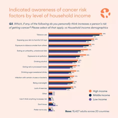 这项调查发现,全球受调查人群对癌症的认识普遍较高。吸烟(63%)、暴露于有害的紫外线(54%)和暴露于他人的烟草烟雾(50%)似乎是最公认的增加患癌风险的因素。同时,缺乏锻炼(28%)、暴露于某些病毒或细菌(28%)和超重(29%)等风险因素被公众认知的程度最低。相比那些来自高收入家庭或受过大学教育的人,受教育程度较低和收入较低的人对癌症风险因素的认识水平较低,这也影响了他们采取措施降低患癌风险。