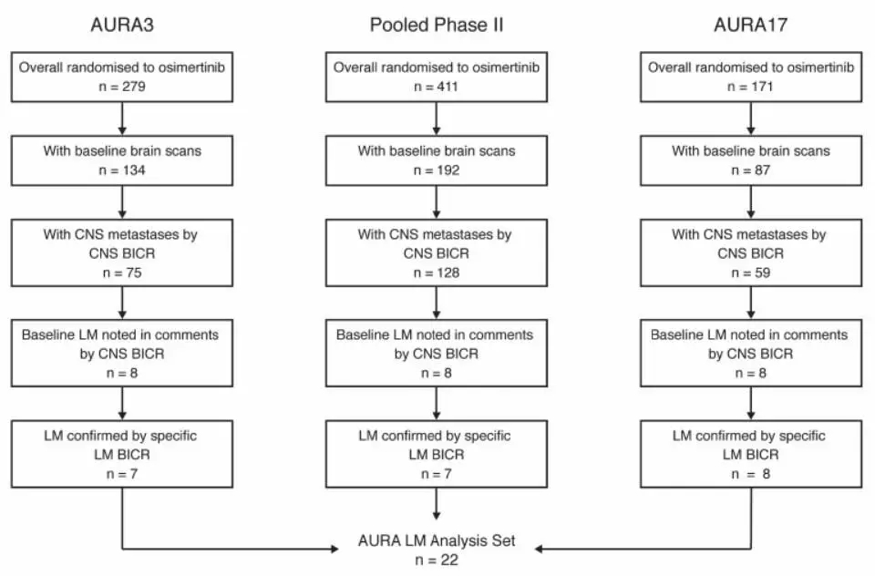 这是一项回顾性研究,纳入AURA2、AURA3、AURA17及AURA扩展队列的患者,这几项研究的入排标准基本相似,其中,AURA17研究仅入组亚太地区患者,AURA3研究中奥希替尼作为二线治疗应用,而AURA扩展队列中,奥希替尼可能作为三线治疗手段应用。疗效评估每6周进行一次。由于该研究并不是预设分析,因此无脑脊液的疗效评估数据。