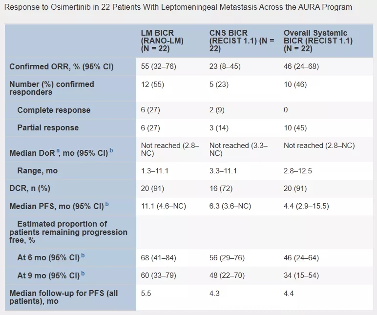 表1. ARUA项目中奥希替尼治疗22例LM转移患者的疗效