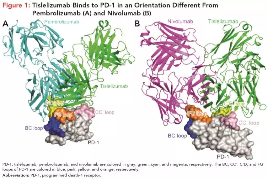 BGB-A317-310是一项随机、双盲、安慰剂对照的III期研究,在中国25~36个研究中心进行,研究将比较替雷利珠单抗联合顺铂或卡铂+吉西他滨与安慰剂联合顺铂或卡铂+吉西他滨作为局部晚期或转移性UC患者一线治疗的疗效和安全性/耐受性。替雷利珠单抗是一个创新的对PD-1具有高亲和力和特异性的单克隆抗体,与PD-1有独特的结合表位(图1),可最大限度地减少与巨噬细胞上FcγR 的结合,从而消除抗体依赖的细胞吞噬作用,这是减少T细胞耗竭和抗PD-1治疗耐药的潜在机制(图2)。