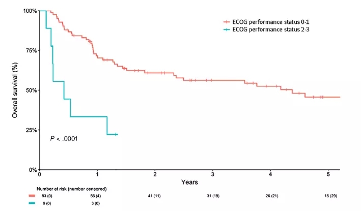 在OS预测的多变量分析中显示:体能状态的ECOG评分及社会支持仍然是OS的显著预测因素。图2显示了按体能状态(ECOG评分)分层的总体生存率(OS)Kaplan-Meier图。