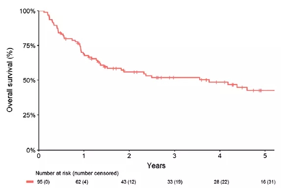 在接受放疗后,中位随访时间为4.5年。在分析时,已知队列中95名患者中有53人死亡,中位OS为3.8年(95%CI:1.5~5.9),其中2年和5年的OS率分别为56%(95%CI:46%~67%)和43%(95%CI:33%~56%),整体的OS的Kaplan-Meier曲线如图1。