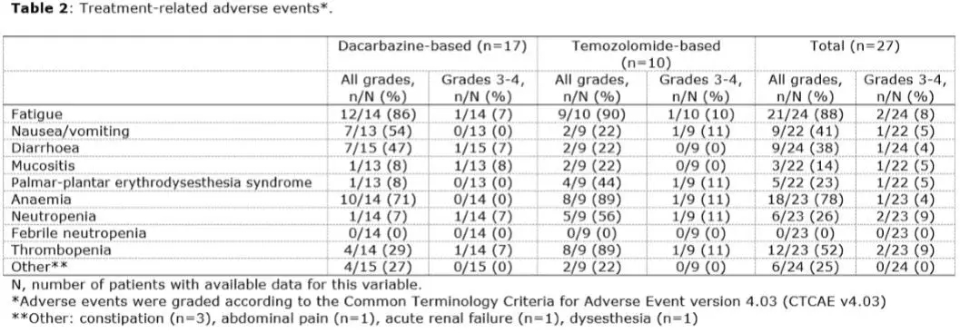 图4. 达卡巴嗪或替莫唑胺为基础的二线化疗方案的治疗反应