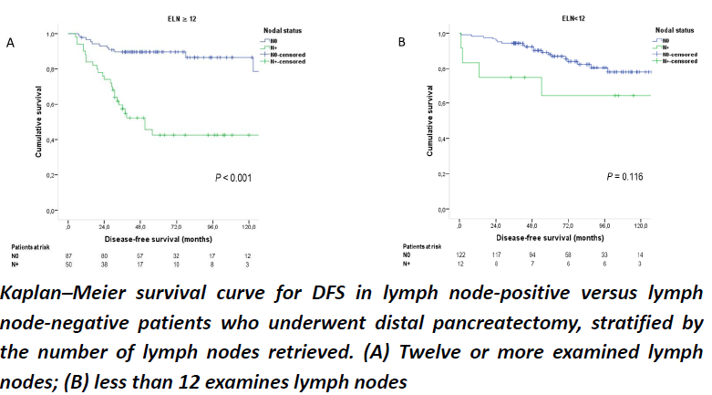 今年ENETS的一项研究评估了非功能性胰腺神经内分泌瘤(NF-PNETs)术后转移性淋巴结数量对无病生存(DFS)的影响,并确定合适淋巴结分期的最低检查淋巴结(LN)数量。该研究回顾性分析了4个欧洲中心的NF-PNETs,将淋巴结转移数分为N1(1-3阳性)和N2(4阳性),结果发现272例患者中,N0、N1和N2患者3年DFS分别为92%、72%和50% (p<0.0001)。在多变量分析中,DFS的预测因子为组织学分级(p=0.019)、T分期(p=0.006)、存在坏死 (p=0.001)和N1 (p=0.018)或N2 (p=0.001)。与转移性淋巴结数较高概率相关的因素有组织学分级、切缘状态、神经和微血管浸润以及检查的N数目。在12个淋巴结检查的患者中,淋巴结状态显著预测复发(p<0.001),小于12个淋巴结检查,则无意义(p=0.116)。提示手术切除的NF-PNETs中N转移的数目可以预测其复发。N0/N1/N2分类可以作为一个有效的复发预测模型应用于NF-PNETs。在接受远端胰腺切除(DP)治疗的NF-PNETs患者中,至少应收集12个N,以进行适当的分期(图4,5,6)[7]。