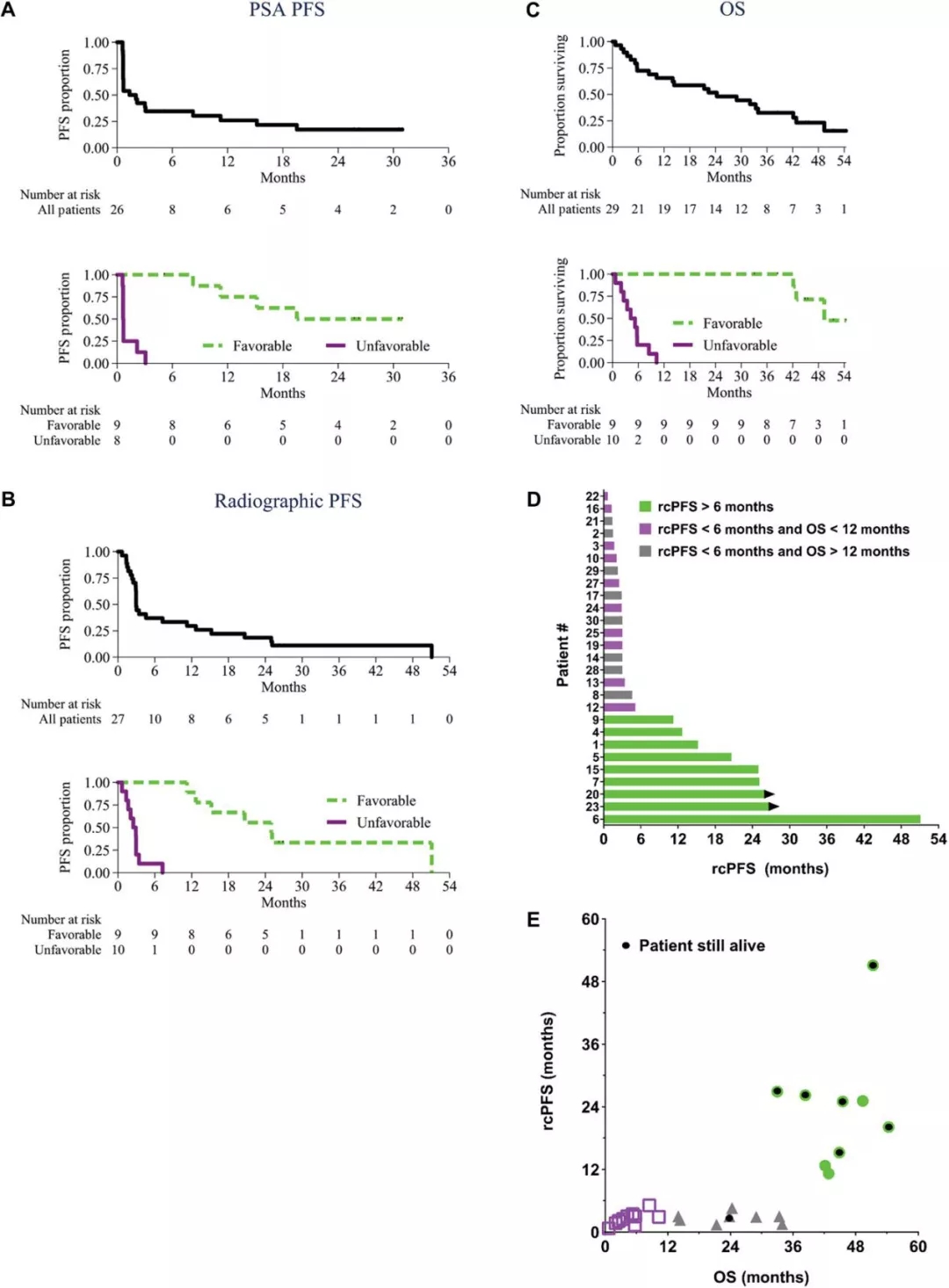 图2. “有利”(绿色)和“不利”亚组在PSA-PFS、rPFS和OS的差异