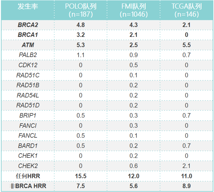 研究一共从POLO试验中获得187(5.6%)例患者的肿瘤样本并进行测序。表中列出了POLO、FMI和TCGA队列中肿瘤HRRm的发生率。与TCGA相比,POLO和FMI队列中的BRCAm发生率较高,可能是由于样本大小、种族或肿瘤样本位置(原发性与转移性)有所差异。BRCA2、BRCA1和ATM的突变最为常见,且多数变异不同时存在。POLO队列中体细胞BRCAm的发生率与FMI队列一致(约2%),且体系和胚系BRCAm不同时存在。在BRCA以外观察到的HRRm中,ATM突变最为普遍。POLO队列中非HRR基因(CDKN2A、SMAD4、KRAS、TP53)的突变率与其他胰腺癌队列中的突变率一致。