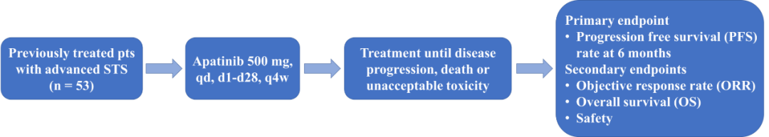 Ahead-S301研究是一项阿帕替尼治疗化疗后进展软组织肉瘤的前瞻性、开放、单臂、多中心的探索性研究,主要研究目的为评价阿帕替尼治疗化疗失败后的晚期软组织肉瘤患者的疗效和安全性(NCT03064243)。阿帕替尼用药方式为每天500mg,d1-d28,每28天为一个治疗周期。每8周根据RECIST V1.1进行一次疗效评估。主要研究终点为6个月无疾病进展生存率(6m-PFS率),次要研究终点为客观缓解率(ORR)和总生存期(OS)。