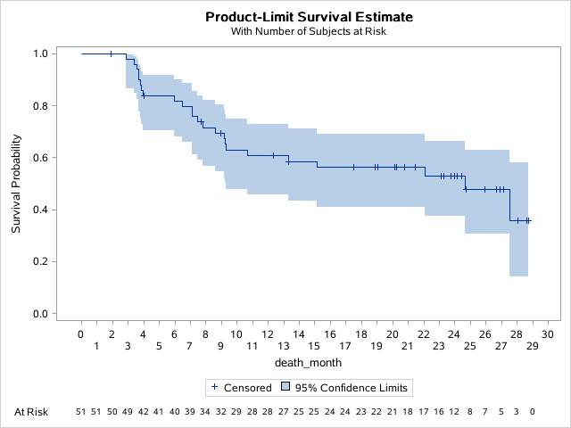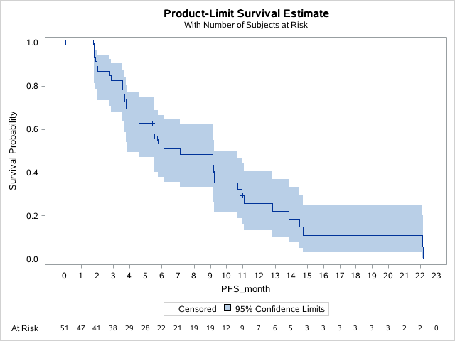 该研究纳入了9家中心,共计入组了53例晚期软组织肉瘤患者,其中51例患者接受了至少2周期阿帕替尼治疗,1名患者仍在接受治疗。主要病理亚型为腺泡状软组织肉瘤(n=11),滑膜肉瘤(n=6),平滑肌肉瘤(n=6),透明细胞肉瘤(n=6)和未分化多形性肉瘤(n=5)。截止2020年1月20日,其中ORR为18.75%(9/48),中位PFS 7.13个月(95%CI 3.84, 9.23),6个月PFS率达到53.32%(95%CI 37.76%, 66.63%)(图1),中位OS达到了24.7个月(9.30-NE)(图2)。常见不良反应为高血压和蛋白尿,发生率分别为84.91%和73.57%。主要的3/4级不良反应为高血压和蛋白尿。