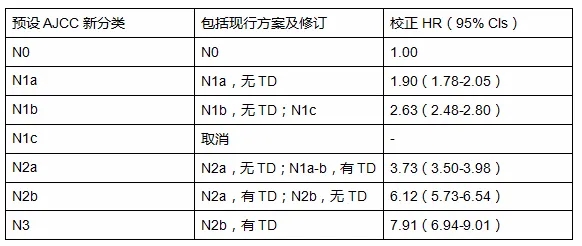 结果:累计分析74494例原发性CRC患者。平均年龄为66.4(SD +/- 13.2)岁,女性36 988例(49.7%),右半结肠40 651例(54.6%)。出现TD者4481例(6.0%),出现淋巴结转移者26 603例(35.7%)。TDs的存在与不良的肿瘤特征显著相关,包括较晚的病理分期、淋巴结转移和远处转移状态、较高的组织分级和神经侵犯。将TDs与各种淋巴结状态相结合,能够独立提示较差的CSS,纳入TDs对淋巴结状态进行重新分类进行多变量回归分析后结果如表中所示。根据多变量回归分析,整合TDs的AJCC淋巴结重新分类联合T分期是CSS的强预测指标,可以成为新的分期系统。