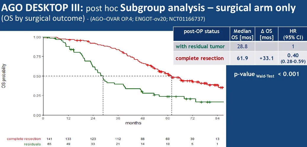 2020 年ASCO年会编号6000的口头报告公布了AGO DESKTOP III/ENGOTov20试验的最终研究结果,也是大家拭目以待的研究,与前期中期数据分析报道的不同是得到了OS和TFST的数据。研究结果显示:相比单纯含铂联合化疗组,二次减瘤术联合含铂联合化疗组患者的OS、PFS和TFST均获益。同时研究发现手术+联合化疗组的死亡率和并发症不增加,研究还发现患者获益的关键在于“手术完全切除”,二次减瘤术有残留病灶,患者不能从中获益,甚至比单纯化疗更差。
