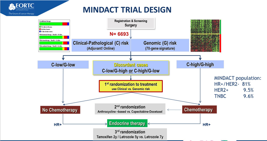 MINDACT是一项探索化疗降级的研究,即通过传统的临床病理特征和MammaPrint基因检测来评估患者的复发风险。两者均低风险(cL/gL)的患者我们建议不进行化疗;两者均高风险(cH/gH)的患者则会建议化疗;而其中一种高风险(如cH/gL或cL/gH)的患者我们会进行随机化,进一步寻找可以避免化疗的患者。