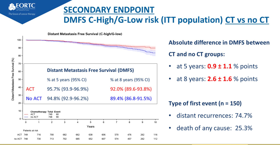 因此,作为一项治疗降级研究,MINDACT研究预设的主要终点是在临床高风险、MammaPrint低风险(cH/gL)的这组患者中,不接受化疗的5年DMFS率达到92%以上。2016年的中位初次分析显示这组患者的5年DMFS率为94.7%。这次中位随访8.7年的二次分析中,有90%的患者至少随访5年,70%的患者至少随访8年,结果看到5年DMFS率高达95.1%,已经远远超过了我们预设的阈值。
