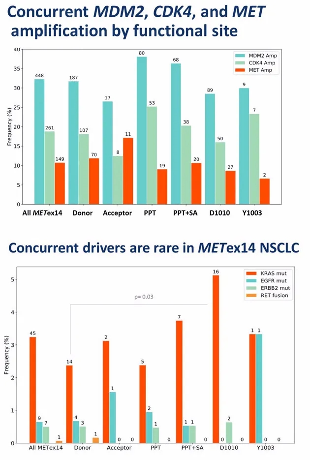 MET 14外显子跳跃突变NSCLC样本中,32%合并 MDM2 扩增;19% 合并 CDK4 扩增;12%存在MET扩增。在MET 14外显子跳跃突变患者中,其他合并驱动基因罕见,所有METex 14样本中 KRAS突变占3.2%,EGFR突变比例为0.65%。