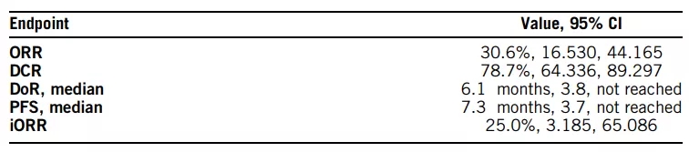 最终,研究共入组59例ALK突变阳性的患者,16例既往接受过ALK-TKI治疗,36.5%基线存在脑转移。98.4%的患者出现任何级别的不良反应,其中3度及以上治疗相关不良反应为33.3%,800mg每日一次剂量组的患者出现1例剂量限制性毒性(3度恶心及呕吐)。最常见的任何级别不良反应分别为恶心(任何级别87.3%;3度以上3.2%)、腹泻(任何级别84.1%;3度以上6.4%)以及转氨酶升高(任何级别65.1%;3度以上4.8%)。基于疗效、安全性及PK数据,后续的推荐治疗剂量为600 mg,每日两次。患者总体ORR为73%,初治和经治患者分别为78.7%和56.3%;DCR为85.7%,中位PFS为12.1个月,初治组和经治组分别为未达到和5.6个月。
