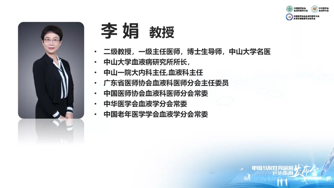 编者按:多发性骨髓瘤(multiple myeloma,MM)是一种浆细胞恶性肿瘤,发病率为血液系统恶性肿瘤的第二位。回顾MM的治疗方案发展进程,MM治疗发展总体可分成三个阶段,分别是传统化疗时代、造血干细胞移植时代和新药时代。从20世纪60年代的马法兰、类固醇激素等传统化疗,到20世纪80~90年代大剂量化疗序贯自体造血干细胞移植(ASCT),2017年开始硼替佐米和沙利度胺、来拿度胺等新药的出现,标志着MM治疗进入了靶向治疗时代。随着治疗方案的进步和变迁,MM患者中位生存期明显延长。中山大学附属第一医院血液内科李娟教授立足于2020年版中国MM诊治指南更新,从冒烟型骨髓瘤和孤立性浆细胞瘤的治疗、初发适合移植的有症状骨髓瘤的治疗和初发不适合移植的有症状骨髓瘤的治疗三方面,重点解析新版指南对于MM初始治疗更新要点;山东大学齐鲁医院血液科王鲁群教授对此部分热点内容进行了点评。