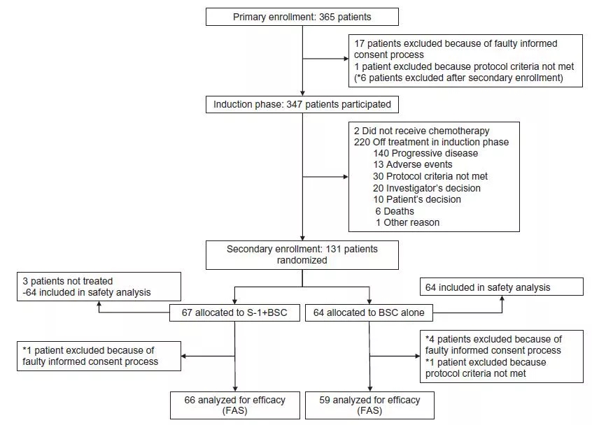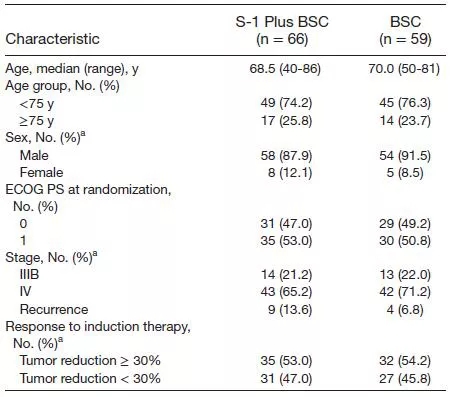 研究基于患者分期(IIIb期或IV期)、研究机构、性别、肿瘤缩小程度(以30%为截断值)进行分层分析。维持阶段S1的治疗剂量与诱导阶段完全一致。治疗应当持续进行,直至疾病进展、出现不可耐受毒性反应或患者撤销知情同意。诱导治疗阶段每6周进行一次疗效评估,随机化以后每4周进行一次疗效评估。主要研究终点为PFS(从随机化以后至疾病进展或患者死亡的时间),次要研究终点为OS(即从随机化开始到患者死亡)。
