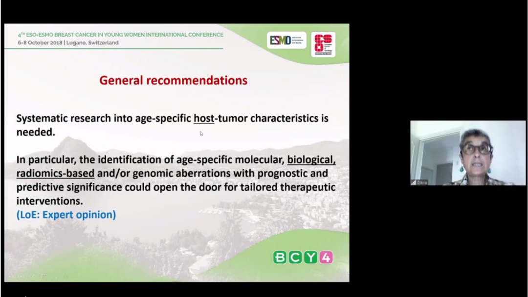 日前,修订后的BCY4指南已于2020年3月发表于Annals of Oncology杂志上,专家意见指出无论早期还是晚期患者,诊疗方案都应在多学科诊疗体系的指导下制定,而乳腺癌的专科诊疗机构是实现此类多学科交叉诊疗最优选择;社会心理学的支持、致病基因筛查以及性与生育方面的指导也建议纳入个体诊疗的计划之内。对于年轻女性患者而言,由于治疗用药时间较长,因此,治疗所带来的副作用更加值得关注;对于年龄相关的分子和生物学因素以及基于放射组学或基因组的预后差异预测等当前尚未明晰的因素,也是之后临床研究中需要重点关注的内容。随后,Pagani教授对上述专家意见进行了解读: